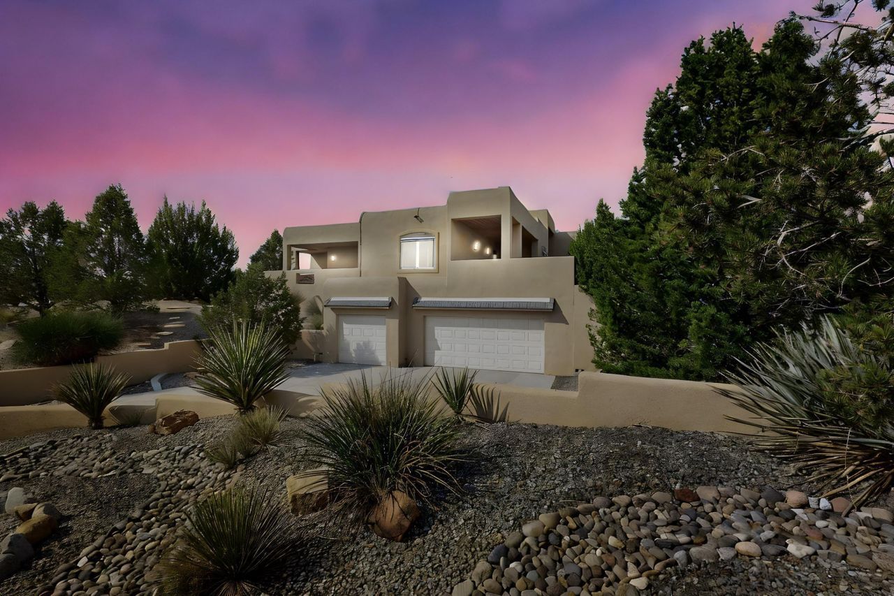 Classic Southwestern home in Placitas with 4,322 sq ft, 4 bedrooms, and 3 baths. High, open ceilings and large windows fill the home with light and frame mountain views. The living room features a double-sided fireplace shared with the primary suite. Two bedrooms open to covered patios, including a private en-suite that features its own incredible views The kitchen connects to the dining and living areas, creating a warm central gathering space. A finished, heated lower-level game room offers flexibility for a theater, gym, or studio. Wraparound composite decks with tongue-and-groove ceilings invite year-round outdoor living. Recent updates include newer roof, stucco, AC units, and reverse osmosis system. An oversized 3-car garage provides convenience and storage.