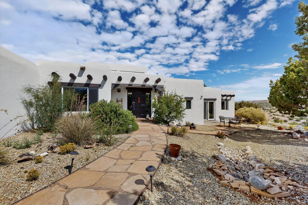 This beautiful home is nestled on a 2.65 acre lot in Rancho de Placitas. Enjoy the private peaceful setting with sensational mountain and mesa views. Southwestern rustic elegance shows throughout the home with vigas, corbels and nichos, herringbone brick floors, Talavera tile in kitchen and baths. Kitchen features an island, gorgeous wood cabinets, gas range and beautiful views from window above the sink. Enjoy the cozy living area with wood burning kiva fireplace and sliding glass doors out to covered patio. Come enjoy the city lights and breathtaking sunsets! Home backs to BLM land. New TPO roof installed Dec 2024 with transferrable warranty. New water heater and dishwasher Oct 2024.