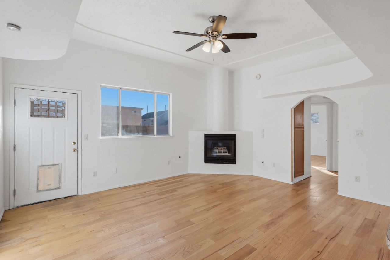 Charming updated Santa Fe style casita nestled just below the majestic Petroglyphs in the desirable Santa Fe Village community! This inviting home features 2 spacious bedrooms with walk-in closets and 2 full baths. The great room offers raised ceilings and a cozy gas log fireplace. Beautiful hardwood and Saltillo tile flooring run throughout, adding classic Southwestern charm. Enjoy a landscaped, low-maintenance private backyard with an east-facing patio perfect for relaxing mornings and shaded evenings. Additional highlights include a 3yr old TPO roof, refrigerated air, a new water heater, and a charming casita-style storage shed. Located near Petroglyph National Monument trails and a nearby dog park. Come see this terrific property it could be your Albuquerque dream home!