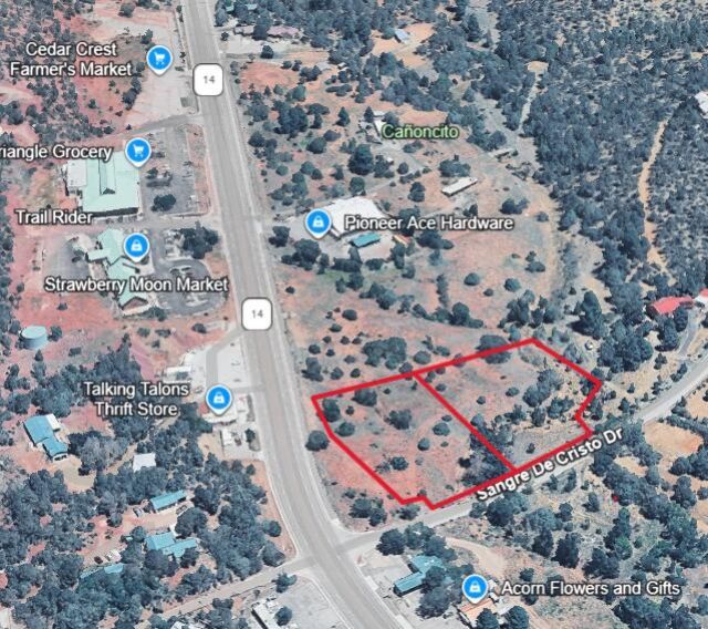 Commercial land opportunity just off North 14 in Cedar Crest, NM. Lots A-3 (+/-1.37 acres) and A-4 (+/-1.50 acres) are offered together for a combined +/-2.87 acres and are zoned C-1. Part of lot is positioned along the main commercial corridor serving the East Mountain area with steady commuter traffic to and from Albuquerque. The site supports a range of retail, office, medical, restaurant, and service uses. Ample acreage allows for efficient site design, parking, and building layout after addressing drainage requirements. Verification of access to utilities will be the responsibility of the buyer. Look at photos for flood map.
